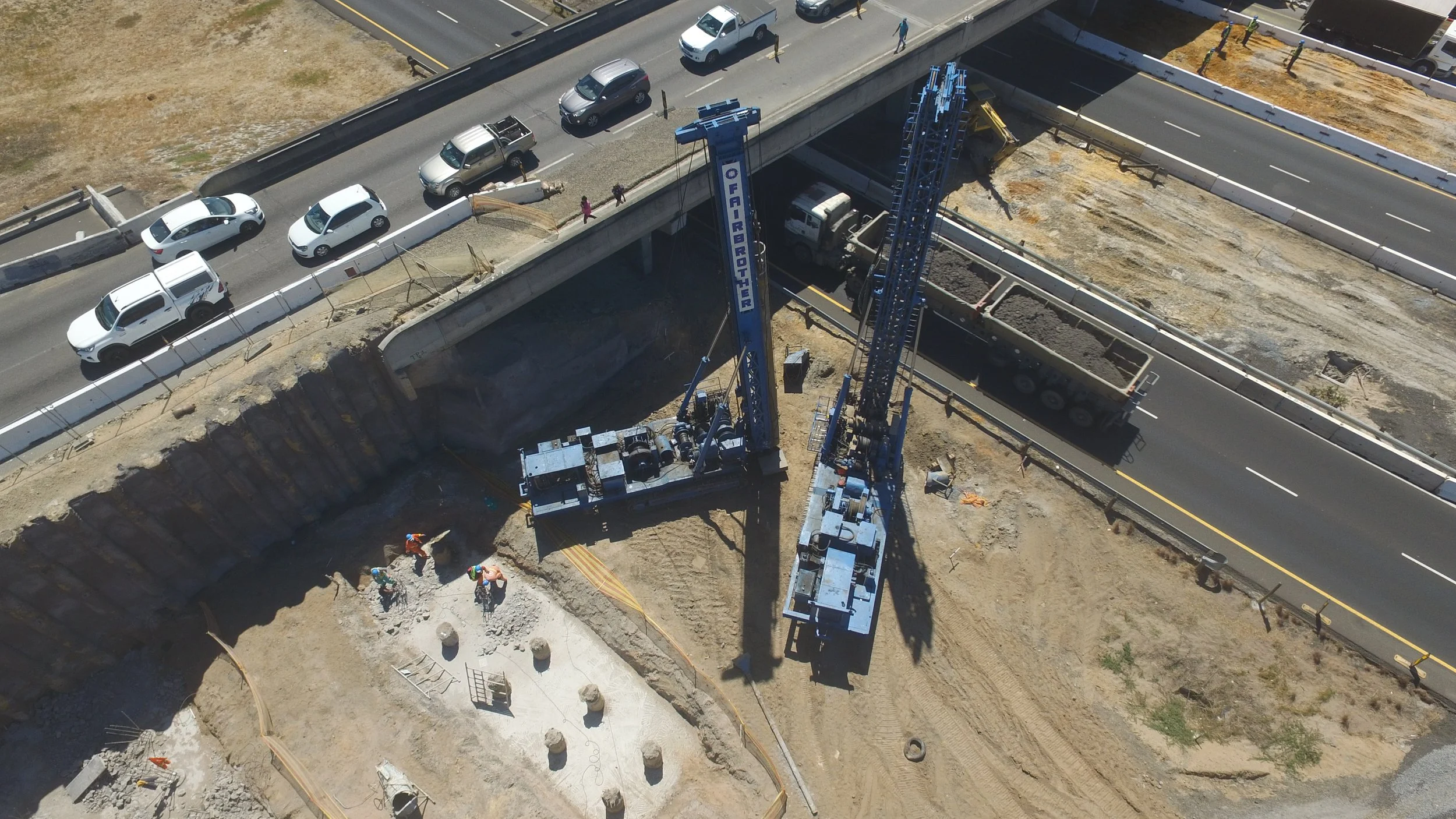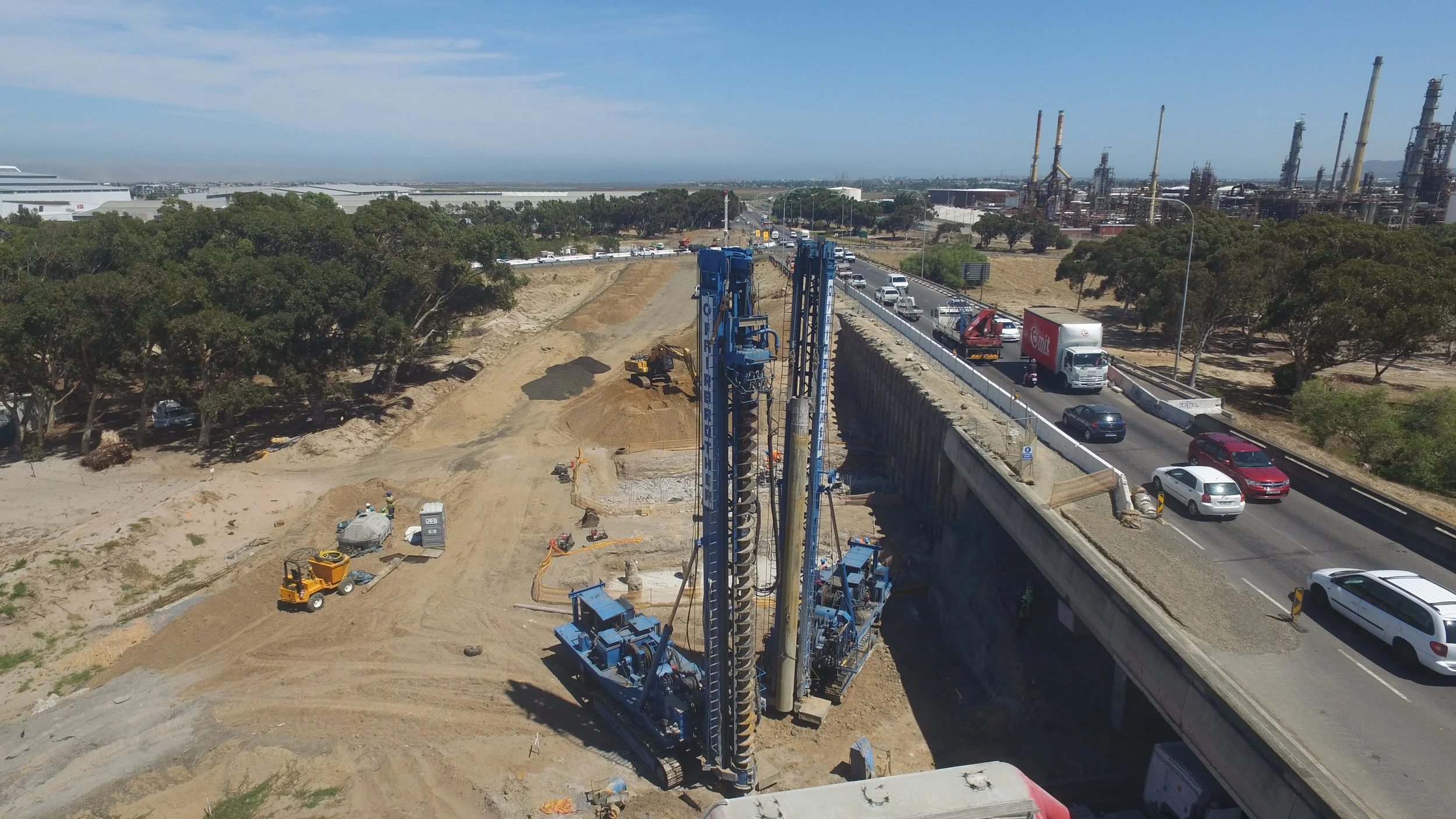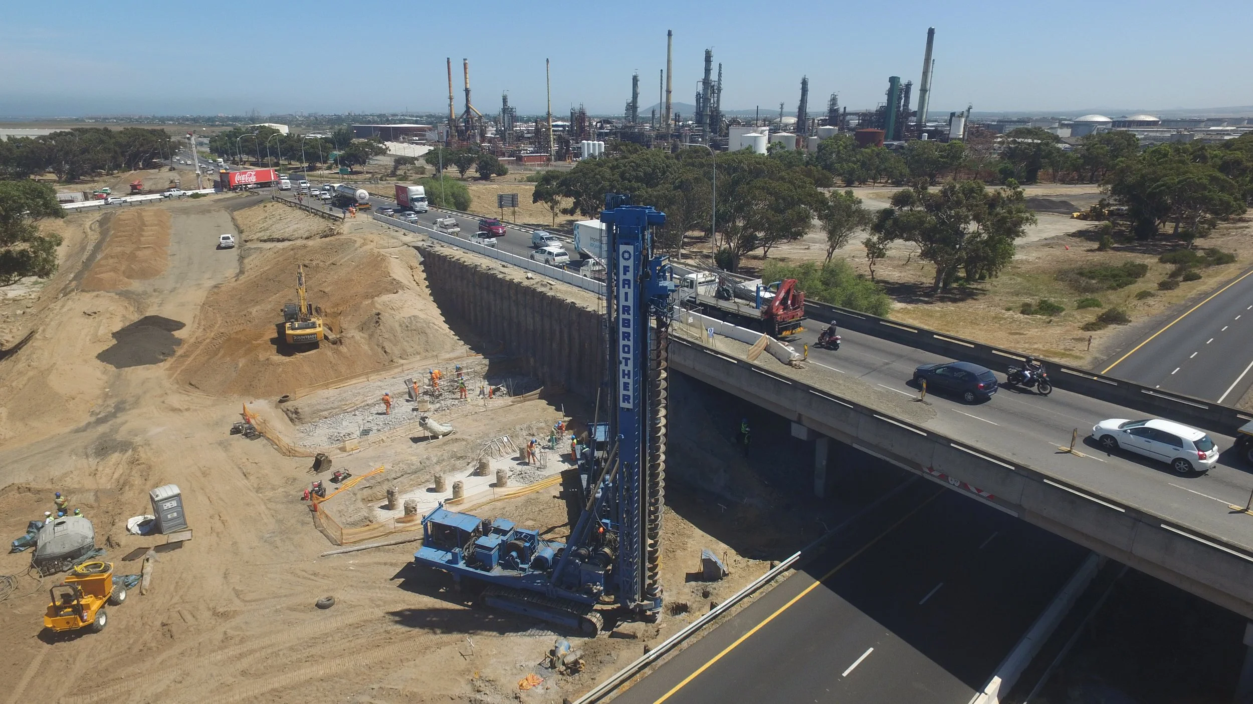 This large-scale infrastructure upgrade involved replacing the existing single-span bridge over the N7 at the Refinery Interchange with a new dual-span bridge, as well as widening the adjacent railway bridge. Fairbrother Geotechnical Engineering was subcontracted by Terrastrata to carry out the installation of all foundation piles at the bridge abutments and piers—specifically pre-augered DCIS (Driven Cast-In-Situ) piles.